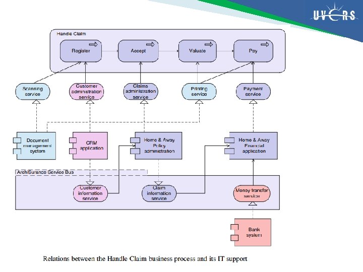 Penyelarasan Bisnis – Aplikasi � Layer aplikasi dan layer bisnis dapat dengan mudah dihubungkan dalam Archi. Mate � Dua jenis hubungan menyediakan kaitan ini: 1) Layanan aplikasi dapat digunakan oleh perilaku bisnis dan antarmuka aplikasi dapat digunakan oleh peran aktor bisnis, misalnya ada hubungan dukungan antara layer aplikasi dan bisnis 2) Data object dapat mewujudkan business object; artinya bahwa sebuah data object adalah sebuah perwujudan elektronik dari business object, misalnya ada sebuah hubungan implementasi antara layer aplikasi dan bisnis