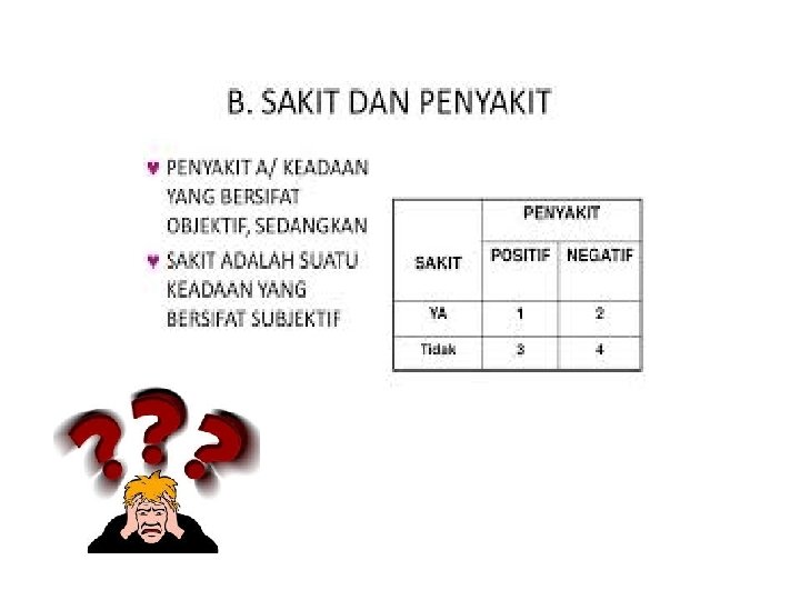 – Kesakitan : Apa yang dirasakan saat dia pergi kedokter, sedangkan penyakit adalah hasil yang di dapat sepulang dia dari dokter ( Dx). ( Helman 1990).