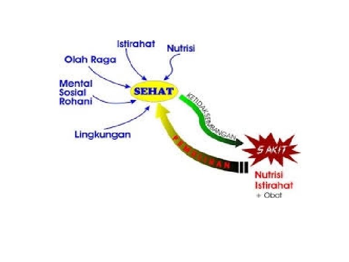 Difinisi sehat : Suatu keadaan kesehimbangan yang dinamis antara bentuk dan fungsi tubuh yang dapat mengadakan penyusuian sehigga tubuh dapat mengatasi gangguan dari luar. (Pepkin, s. )