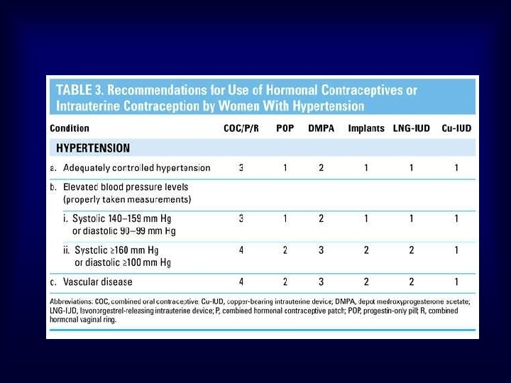 HİPERTANSİYON Kr. olgularda rölatif MI ve inme riski artar. OCs-Kontrol altındaki ve <35 yaş olgularda kontrollü olarak kullanılabilir. P Hap- KB yükselmesi ve kardiak risk artışına dair bilgi yoktur. Güvenle kullanılabilirler.