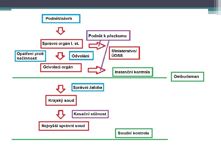 Ombudsman • Specializovaný kontrolní orgán • Není zakotven v Ústavě, pouze na základě zákona • Ochrana osob před jednáním úřadů a dalších institucí pokud je v rozporu s právem, neodpovídá principům demokratického právního státu a dobré správy • Národní preventivní mechanismus proti mučení a jinému krutému, nelidskému či ponižujícímu zacházení nebo trestání • Ochrana před diskriminací