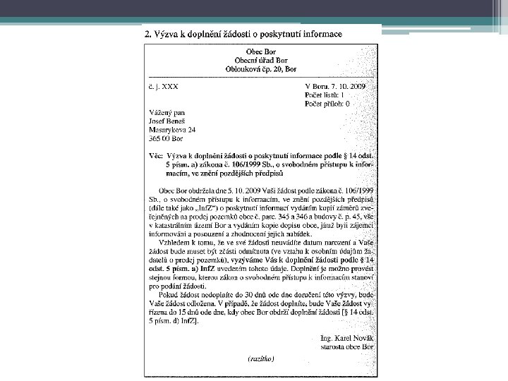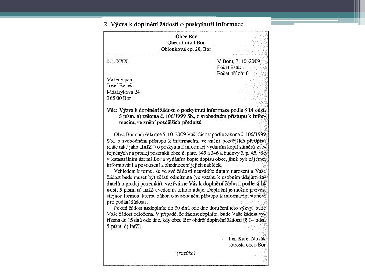 Postup povinného subjektu • a) brání-li nedostatek údajů o žadateli postupu vyřízení žádosti o informaci, vyzve žadatele k doplnění; nedoplní-li žádost odloží, • b) je-li žádost nesrozumitelná, vyzve žadatele, aby žádost upřesnil, neupřesní-li, rozhodne o odmítnutí žádosti, • c) v případě, že požadované informace se nevztahují k jeho působnosti, žádost odloží a tuto odůvodněnou skutečnost sdělí žadateli, • d) nerozhodne-li o odmítnutí žádosti, poskytne informaci