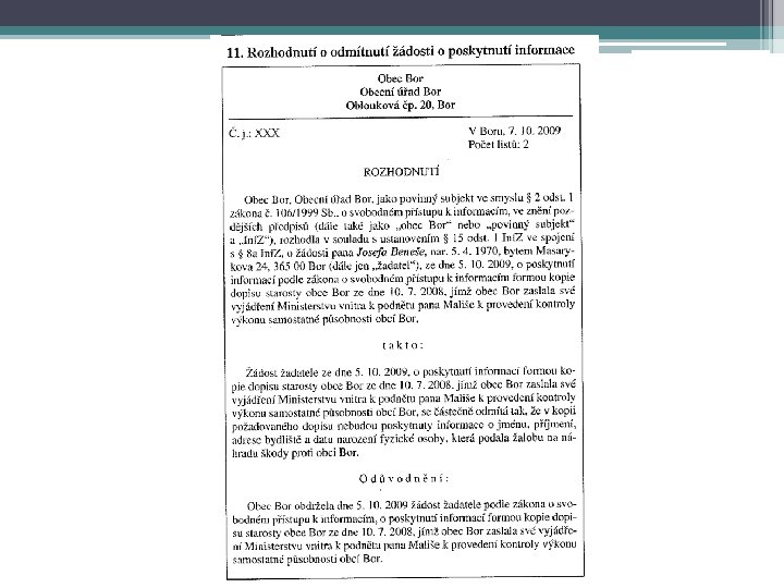 Postup povinného subjektu • pokud povinný subjekt žádosti, byť i jen zčásti, nevyhoví, vydá rozhodnutí o odmítnutí žádosti, popřípadě o odmítnutí části žádosti • lze se bránit odvoláním nebo stížností