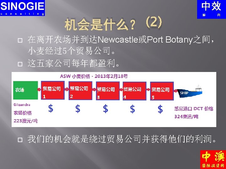 What is the opportunity? (2) Between leaving the farm and arriving at Newcastle or Port Botany, the wheat goes through up to five trading companies. Each of these five companies makes a profit. Our opportunity is to bypass the trading companies and take their profit.