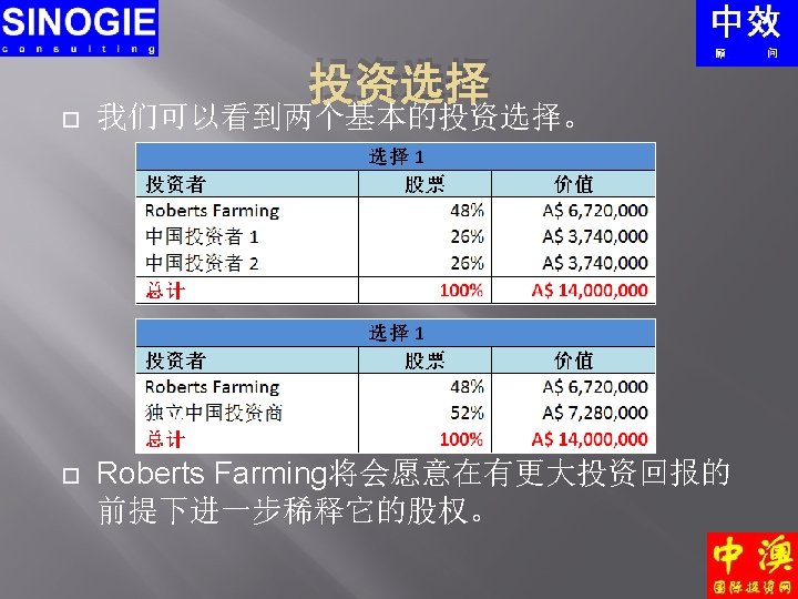 Investment options We see two basic investment options. Roberts Farming would be willing to dilute its equity stake in return for a larger investment.