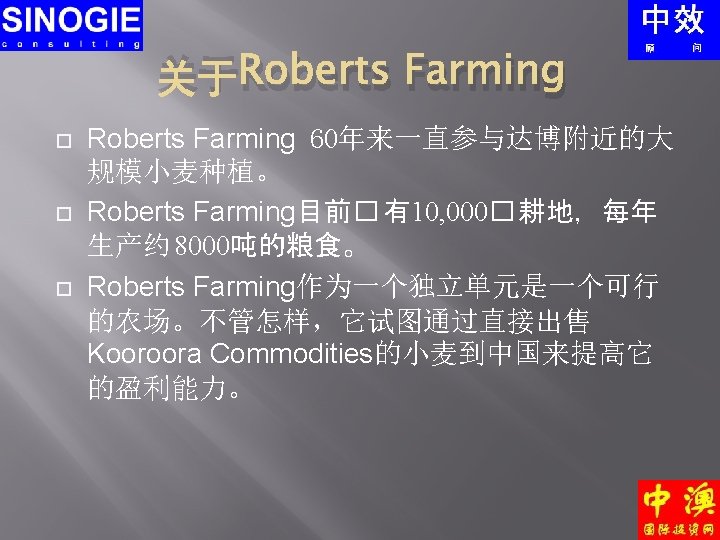 About Roberts Farming has been involved in largescale wheat farming near Dubbo for 60 years. Roberts Farming currently owns 10, 000 acres of farmland, and produces approximately 8, 000 tonnes of grain per year. Roberts Farming is, as a standalone unit, a viable farming operation. However, it seeks to improve its profitability through the direct sale of wheat to China through Kooroora Commodities.