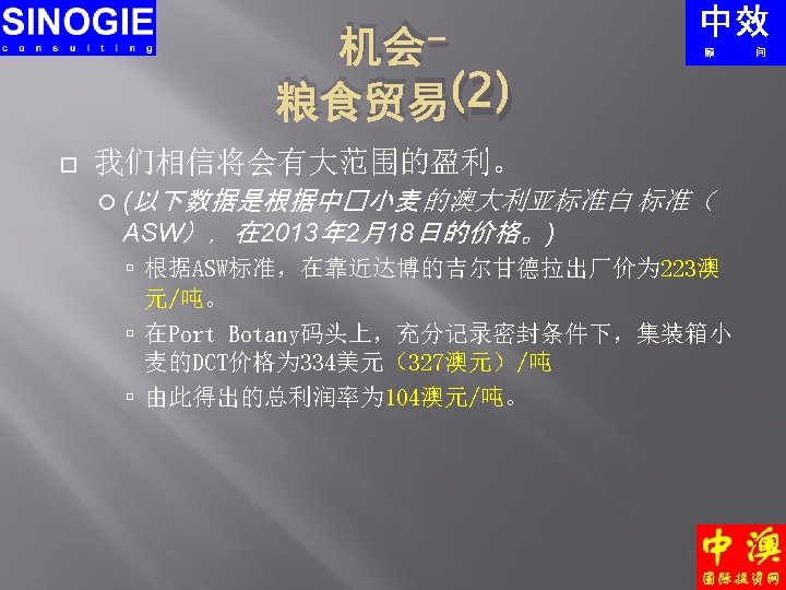 The opportunity – grain trading (2) We believe there is significant scope for profit. (The figures below are based on Australian Standard White (“ASW”), a medium-grade wheat. Prices are as at February 18, 2013. ) The farm-gate price for ASW in Gilgandra, near Dubbo, was A$ 223 per tonne. The DCT price for fully-documented sealed, containerised wheat on the dock at Port Botany was US$ 334 (A$ 327) per tonne. This gives a total margin of A$ 104 per tonne.