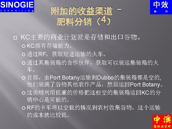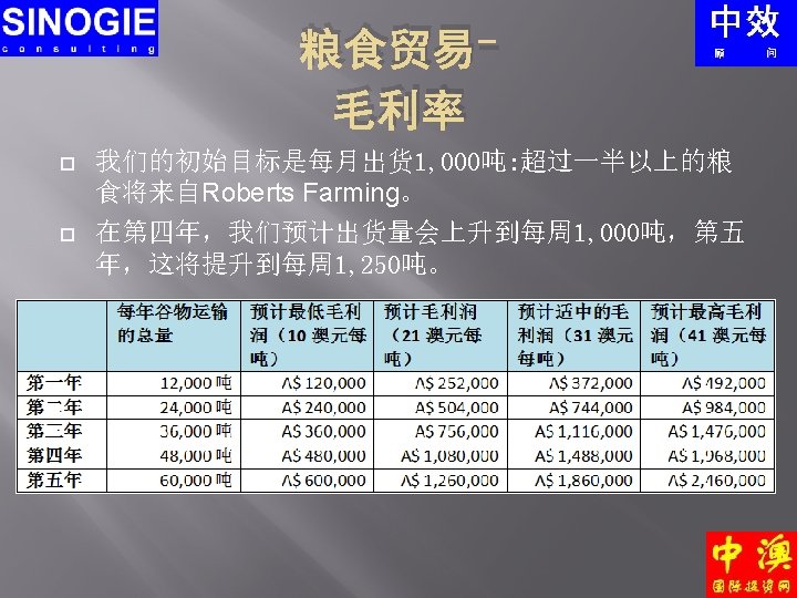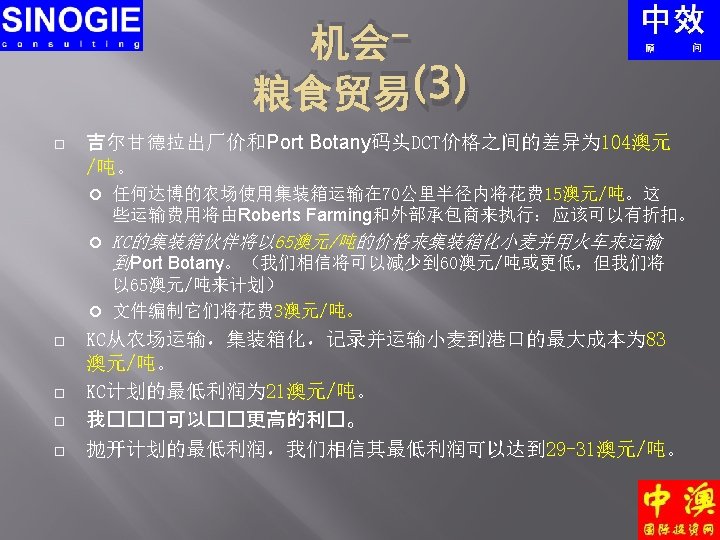 The opportunity – grain trading (3) The difference between the farm-gate price at Gilgandra and the DCT price at Port Botany is A$ 104 per tonne. Transportation from any farm within a 70 km radius of Dubbo to a containerisation facility will cost A$ 15 per tonne. This transportation will be carried out by Roberts Farming and outside contractors: discounts should be available. KC’s containerisation partner will containerise the wheat and send it by train to Port Botany for A$ 65 per tonne. (We believe that it will be possible to reduce this to A$ 60 per tonne or lower, but we will use the A$ 65 price for planning. ) Documentation costs are A$ 3 per tonne. The maximum cost to KC of transporting wheat from farms, containerising them, documenting them, and taking them to port is therefore A$ 83 per tonne. This gives KC a projected minimum margin of A$ 21 per tonne. We expect that higher margins can be achieved. With projected discounts, we believe a minimum margin of A$ 2931 per tonne can be achieved