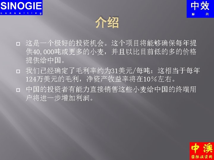 Introduction This is an opportunity to invest in a project which will be able to secure 40, 000 tonnes of wheat or more per year, and deliver it to China at far lower prices than are currently possible. We have identified a gross margin of approximately US$ 31 per tonne: this equates to a gross profit of US$ 1. 24 million per year, or an ROE of around 10%. A Chinese investor with the ability to sell wheat directly to Chinese end-users would be able to further increase this margin.