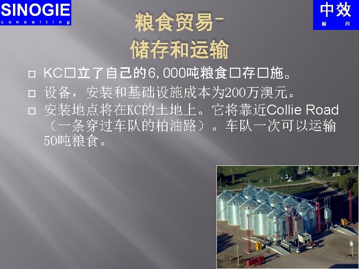 Grain trading – Storage and transportation KC will set up its own 6, 000 -tonne grain storage facility. The equipment, installation, and groundwork will cost A$ 2, 000. The site will be installed on KC’s land. It will be close to Collie Road (a paved road with roadtrain access). Roadtrains can carry 50 tonnes of grain at a time.