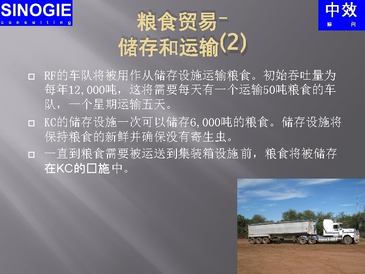 Grain trading – Storage and transportation (2) RF’s roadtrains will be used to transport grain to and from the storage facility. With initial throughput of 12, 000 tonnes per year, this will require one 50 -tonne roadtrain per day, five days per week. Up to 6, 000 tonnes of grain can be stored at KC’s storage facility at any one time. The storage facility will keep the grain fresh and free of parasites. Grain will be stored at KC’s facility until it needs to be transported to the containerisation facility.