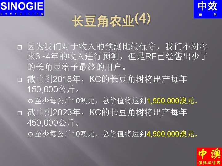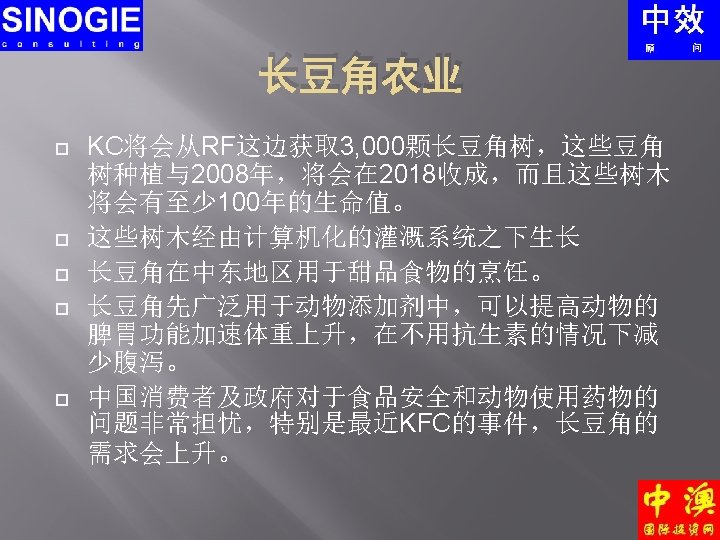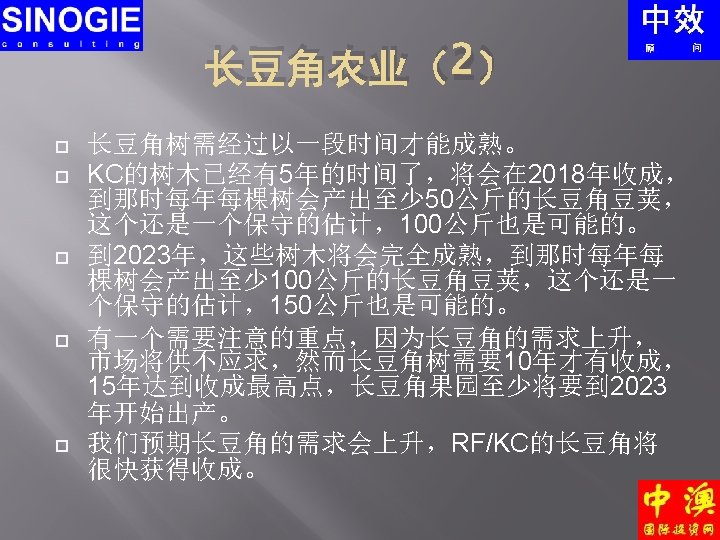 Carob farming KC will take possession of 3, 000 carob trees from RF. These trees were planted in 2008, and will reach commercial maturity in 2018. The trees will have a productive life of at least 100 years. The trees are fed by a computerised drip-irrigation system. Carob is used in the Middle East as an ingredient for sweet food. Carob is increasingly used as a food additive for animals. It enhances animals’ appetite and speeds weight gain, and prevents diarrhoea and intestinal infections without the use of antibiotics. As Chinese consumers and the Chinese government become more concerned about food safety and the use of drugs in animals – especially after the recent KFC scandal – demand for carob will increase.