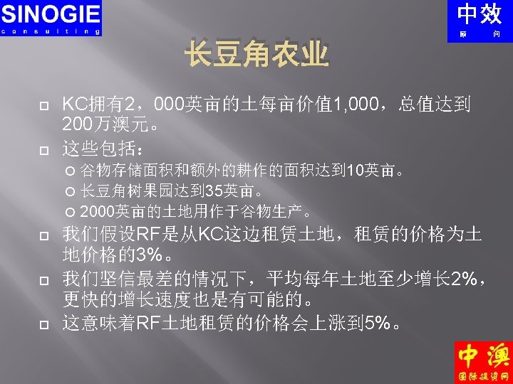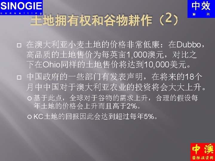 Land ownership and grain farming (2) Australian wheat-farming land is very undervalued: high-quality farmland near Dubbo costs around A$ 1, 000 per acre, compared to US$ 10, 000 per acre for similar land in Ohio. Several units in the Chinese government have said that Chinese investment in Australian agriculture will increase significantly over the next 18 months. Based on this, and on increasing global demand for grain, it is reasonable to assume that the value of the land will increase by far more than 2% per year. The return on KC’s farmland is therefore likely to be more than 5% per year.
