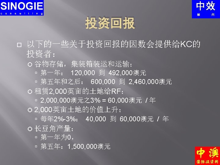 Return on investment The following factors will provide KC’s investors with a return on investment. Grain storage, containerisation and trading. A$ 120, 000 to A$ 492, 000 in Year 1. A$ 600, 000 to A$ 2, 460, 000 in Year 5 and subsequent years. (Note – these figures are calculated after all transportation costs. ) Rental of 2000 acres of land to RF. 3% of A$ 2, 000 = A$ 60, 000. Land-value appreciation on 2, 000 acres. 2% – 3% of A$ 2, 000 = A$ 40, 000 – A$ 60, 000. Carob crop. Zero in Year 1 A$ 1, 500, 000 in Year 5.