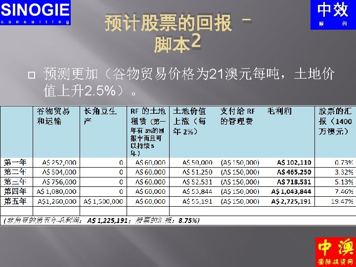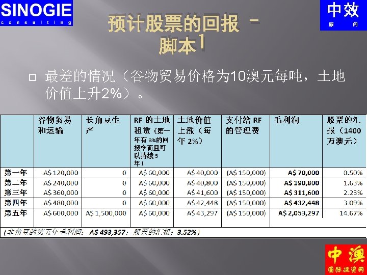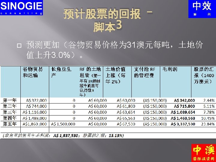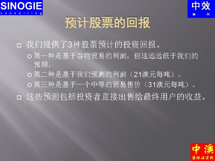 Projected return on equity We have provided three sets of projected return on equity. The first is based on a margin on grain trading after costs of A$ 10 per tonne; this is far less than we expect. The second is based on our projected minimum margin after costs on grain trading, of A$ 21 per tonne. The third is based on a median margin after costs on grain trading of A$ 31 per tonne. These projections do not include additional revenue which the investor may be able to earn by selling grain directly to end-users in China.
