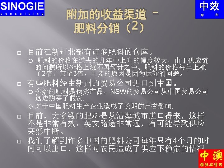 Additional revenue stream – fertiliser distribution (2) There is currently a severe shortage of fertiliser in North-West NSW. Fertiliser prices have risen significantly over the past few years. Price rises are unpredictable because of supply-chain problems – in some years, fertiliser prices have more than doubled, and even trebled, from year to year. Much of this is because it is difficult to transport fertiliser to North-West NSW from bases in Sydney and Newcastle. Some fertiliser is being imported from China by NSW-based trading companies. Much of this fertiliser is fake or sub-standard: the NSW trading companies are buying from dishonest Chinese trading companies. This is causing long-term damage to the reputation of Chinese fertiliser manufacturers. At present, most fertiliser is being imported and distributed from coastal cities. This is inefficient, as these cities are a long way from the best farmland. It can also lead to supplies suddenly being cut off. We know that many Chinese fertiliser companies are only able to export fertiliser four months per year. This creates problems for farmers needing a steady supply.