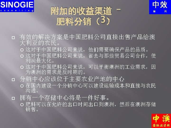 Additional revenue stream – fertiliser distribution (3) The ideal solution would be for a Chinese company to sell fertiliser directly to Australian farmers. This would allow the fertiliser company to ensure that only genuine, high-quality fertiliser goes to Australian farmers. It would also allow the fertiliser company to bypass traders and maximise profit. Selling to Australia would allow the fertiliser company to even out demand, as Australian demand is counter-cyclical to Chinese demand. The distribution centre should be in the middle of prime farming land. Creating an inland distribution hub would minimise transportation costs and allow direct contact with farmers. It would be good to have a storage centre. Fertiliser could then be exported during export periods and stored in Australia for sale throughout the year.