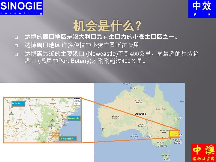 What is the opportunity? The area around Dubbo is one of the most productive wheatgrowing areas in Australia. Much of the wheat grown around Dubbo is eaten in China. Dubbo is just under 400 km from the nearest major port (Newcastle), and just over 400 km from the nearest container port (Port Botany in Sydney).