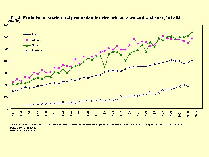 Fig. 6. Evolution of world total production for broiler, beef, and pork, ’ 61 -‘ 04 (100万t) (Million MT) 1000 Broiler 900 Beef&Veal 800 Pork 700 600 500 400 300 200 100 2005 2003 2001 1999 1997 1995 1993 1991 1989 1987 1985 1983 1981 1979 1977 1975 1973 1971 1969 1967 1965 1963 1961 0 Source: S. Ito; World Food Statistics and Graphics (http: //worldfood. muses. tottori-u. ac. jp), Tottori University, Japan, June 15, 2004. (Original sources are from ERS/USDA; PS&D View , June 2004).