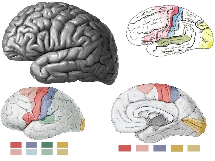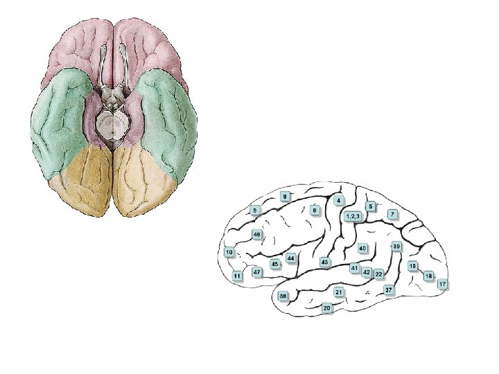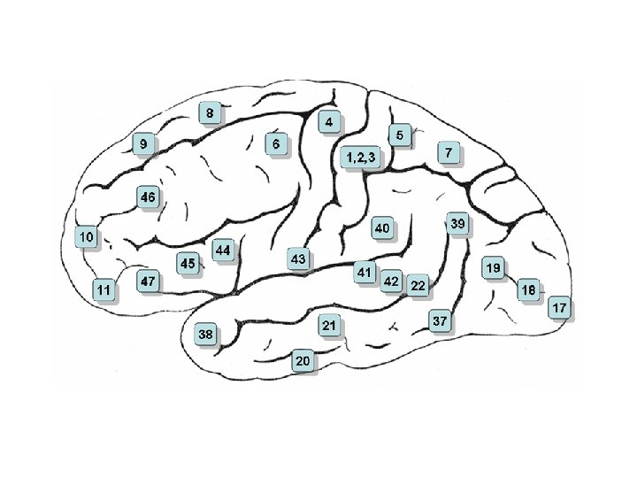 REGIO AREAE FUNKCE POZNÁMKA Postcentralis 1, 2, 3, 43, (2 s) somatosenzorická, zakončení chuťová thalamokortikálníc h vláken Praecentralis 4, 6, (4 s) motorická Betzovy pyramidové buňky Frontalis 8, 9, 10, 11, 44, 45, 46, 47, (8 s) asociační volní úkony, vliv na mimovolní oblast Insularis 13, 14, 15, 16 integrační Temporalis 20, 21, 22, 36, 37, 38, 41, 42, sluchová 52 rozdíly mezi druhy Parietalis 5, 7, 39, 40 asociační vztah k somestézii Occipitalis 17, 18, 19, (19 s) zraková k zrakové kůře patří i další oblasti Cingularis 23, 24, 31, 32, 33 mimovolní limbický systém Retrospleniali s 26, 29, 30 mimovolní limbická, alokortex Hippocampic a 27, 28, 34, 35, 48, 51 čich (34), mimovolní paměť Olfactoria area olfactoria čichová tzv. bazální Brodmannovo dělení mozkové kůry