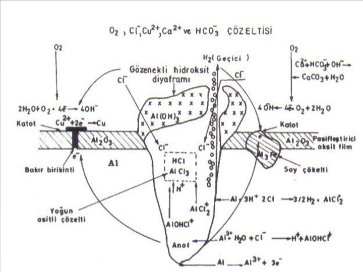 � Başlangıçta aralık içinde ve bütün yüzeyde bu tepkimeler aynı biçimde yürürler. Metal iyonunun oluşmasında salınan her elektron hemen oksijen indirgenmesi için harcanır. � Kısa bir süre sonra aralık içine oksijen ulaşımı sınırlı olduğundan , oksijen tükenir ve böylece oksijen indirgenmesi durur. Ancak korozyon aynı hızla devam eder. � Metalin diğer kısmıyla 50 -100 m. V luk bir potansiyel fark oluşur � Klor iyonları metale göç etmesi ile � MCl 2+2 H 2 O ↔ M(OH)2↓ +2 HCl Bu denklem göre ; klorür ve hidrojen iyonu birçok metalin korozyonunu hızlandırır.