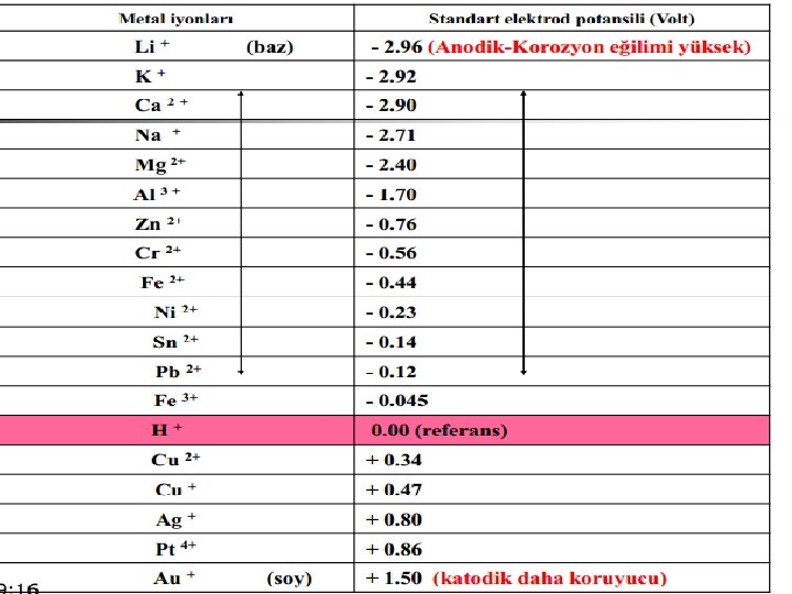 � Bu çizelgede aynı gurup içerisinde verilen metaller in durumu ilginçtir. Ne kadar birbirine yakın metallerse korozyon o kadar düşüktür ancak potansiyel fark arttıkça korozyon riski artmaktadır.