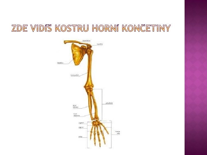 KOSTRA HORNÍ KONČETINY �K trupu je horní končetina připevněna klíční kostí a lopatkou � Horní končetiny slouží k uchopování , umožňuje práci � Volná část horní končetiny je tvořena kostí pažní, kostmi předloktí /loketní a vřetenní kost/ � Kostru ruky tvoří kosti zápěstní, záprstní a drobné kosti článků prstů