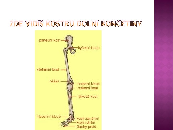 KOSTRA DOLNÍ KONČETINY � Dolní končetiny nesou celé tělo a umožňují pohyb celého � Dolní končetina je k trupu připevněna pánevní kostí � Volná část je tvořena stehenní kostí, kostí je to největší a nejmohutnější kost v lidském těle � Následují kosti lýtková a holenní � Kostru nohy tvoří kůstky zánártní, záprstní a články prstů � mezi jednotlivými kostmi jsou klouby: kolenní, hlezenní a drobné klouby mezi kostmi nártními, záprstními a ve článcích prstů