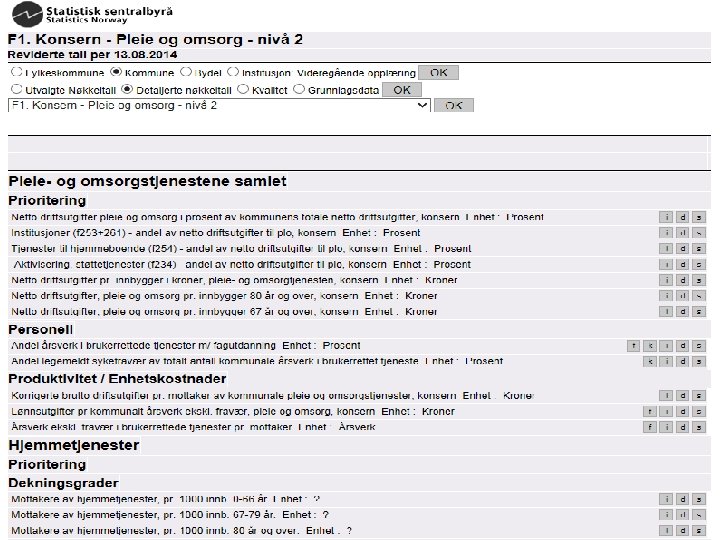 …. nesten for først en kjapp repetisjon…. • Indikatorer for prioritering = netto driftsutgifter pr innbygger i målgruppa • Indikatorer for «produktivitet» /enhetskostnader = korrigerte brutto driftsutgifter pr mottaker/plass • Indikatorer for dekningsgrader = måler andelen i en målgruppe som mottar tjenester, f. eks antall innbyggere 80 år+ på institusjon i fht alle innbyggere 80 år+