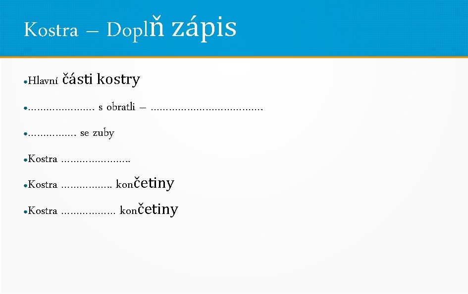 Kostra – Doplnění textu Tvoří ………………. . těla ● Chrání ………… orgány – ………………. . ● Umožňuje spolu se svaly ……………. ● Kosti jsou spojeny: ● …………………. . kloubem ● Velké kosti obsahují kostní …………. . – tvorba ……………. Pokračování najdete na dalším snímku ●