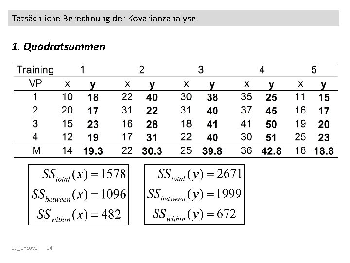 Tatsächliche Berechnung der Kovarianzanalyse 1. Quadratsummen • Quadratsummenzerlegung für die AV (y) und die Kovariate (x) 09_ancova 13