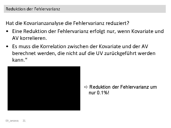 Tatsächliche Berechnung der Kovarianzanalyse 4. F-Test und Freiheitsgrade Fkrit = 3. 11 signifikanter Effekt der Lernmethode auf den Lernerfolg wenn gleichzeitig die mathematisch-logische Vorkenntnisse kontrolliert werden. 09_ancova 20