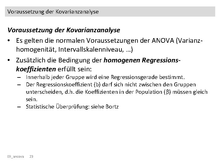 Voraussetzung der Kovarianzanalyse • Es gelten die normalen Voraussetzungen der ANOVA (Varianzhomogenität, Intervallskalenniveau, …) • Zusätzlich die Bedingung der homogenen Regressionskoeffizienten erfüllt sein: – Innerhalb jeder Gruppe wird eine Regressionsgerade bestimmt. – Der Regressionskoeffizient (b) darf sich nicht zwischen den Gruppen unterscheiden, d. h. die Koeffizienten in der Population (β) müssen gleich sein. – Statistische Überprüfung: siehe Bortz 09_ancova 22
