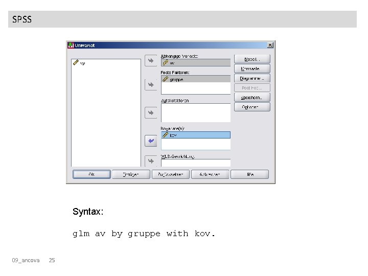 SPSS Syntax: glm av by gruppe with kov. 09_ancova 25
