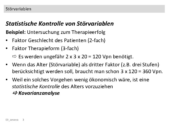 Störvariablen Statistische Kontrolle von Störvariablen Beispiel: Untersuchung zum Therapieerfolg • Faktor Geschlecht des Patienten (2 -fach) • Faktor Therapieform (3 -fach) Es werden ungefähr 2 x 3 x 20 = 120 Vpn benötigt. • Wenn das Alter (Störvariable) als dritter Faktor (z. B. drei Stufen) berücksichtigt werden soll, braucht man schon 3 x 120 = 360 Vpn. • Weil ein solches Vorgehen wenig ökonomisch wäre, ist eine statistische Kontrolle des Alters vorzuziehen Kovarianzanalyse 09_ancova 3
