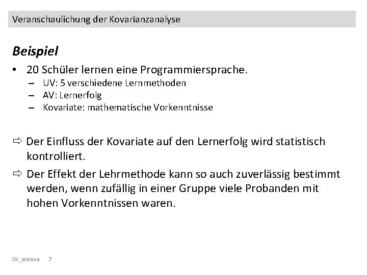 Veranschaulichung der Kovarianzanalyse Regression • Residuum = nicht durch Prädiktor (x) vorhersagbarer „Rest“ des Kriteriums (y). • Varianz der Residuen (Streuung der Datenpunkte um die Regressionsgerade) = nicht vorhergesagte (erklärte) Varianz 09_ancova 6
