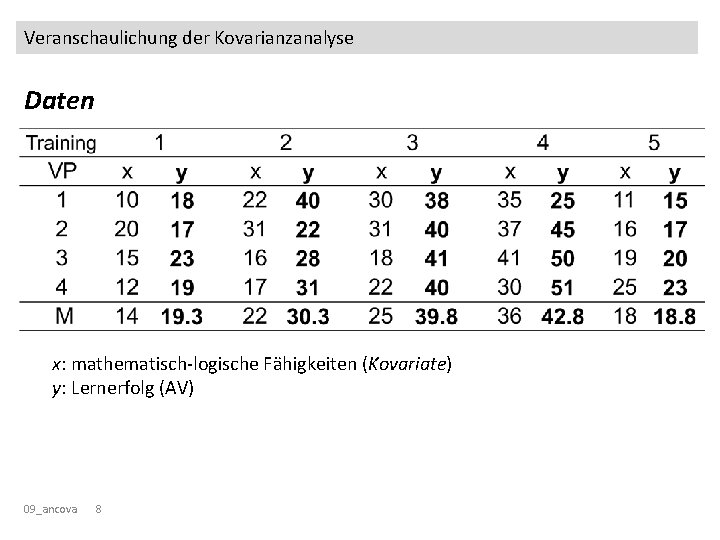 Veranschaulichung der Kovarianzanalyse Daten x: mathematisch-logische Fähigkeiten (Kovariate) y: Lernerfolg (AV) 09_ancova 8