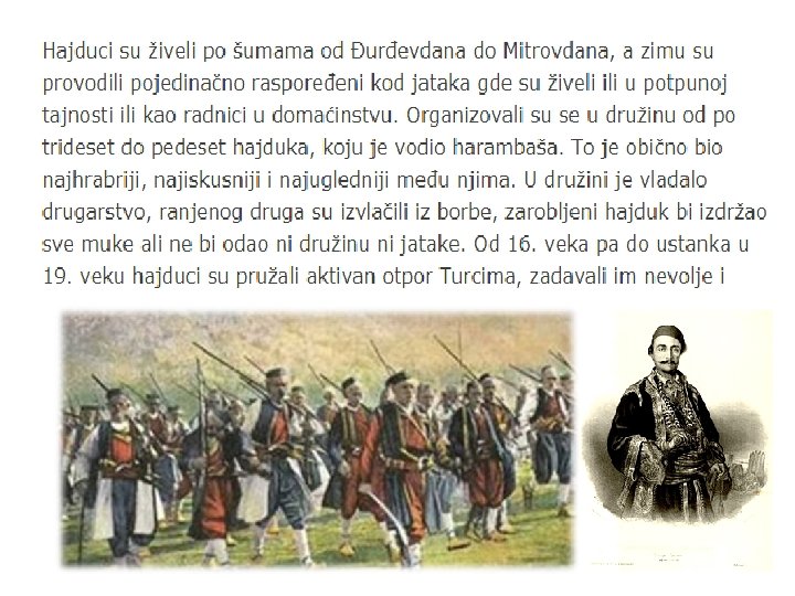 U srpskim epskim narodnim pesmama opevani su junački podvizi naših predaka i istorijski događaji, hajduci, hrabri srpski odmetnici koji su se borili protiv turskog zuluma ( zuluma ugnjetavanja, mučenja) i bili zaštitnici porobljenog srpskog naroda. Lirsko-epske pesme — balade su pesme u kojojima je opevan neki tužan događaj. Događaj je najčešće iz porodičnog života. Balada nije vedra pesma, već potresna, dramatična, tužna. Događaj u njima dat je vrlo osećajno. Govore o životu našeg naroda u periodu koji je za naš narod bio veoma težak. Živeli su u veoma teškim uslovima pod ropstvom ali nisu zaboravili ni jednog trenutka koliko je bitno biti pošten i odan porodičnim vrednostima.
