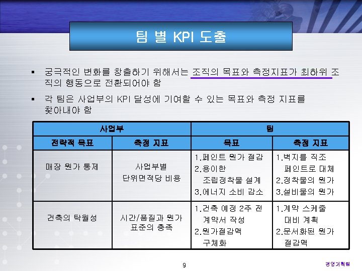 KPI의 균형 검토 § 여러 차원을 고려한 균형 잡힌 측정지표(balanced metric)를 도출함 § KPI perspective, KPI family, KPI Category, KPI focus § 위 차원들에 비추어 봄으로서 효율적 KPI 도출 지원 : Feedback 포함 KPI Perspective & Family 재무관점 고객관점 Financial v v Profitability Cost Savings Resource Utilization Staff Productivity Customer v v Internal Processes v v KPI Category Process Quality Productivity Cycle Time Process Efficiency 내부 비즈니스 프로세스 Product Quality Product Innovation Timeliness Service Quality • • • KPI Focus Learning & Growth v v Innovation Technology Growth Knowledge Sharing Direct Percent Simple Ratio Index Composite Average Statistics • • • Time Horizon Indicator Type View Level Purpose 학습과 성장관점 1 경영기획팀