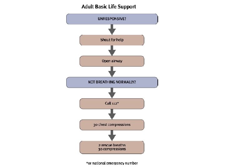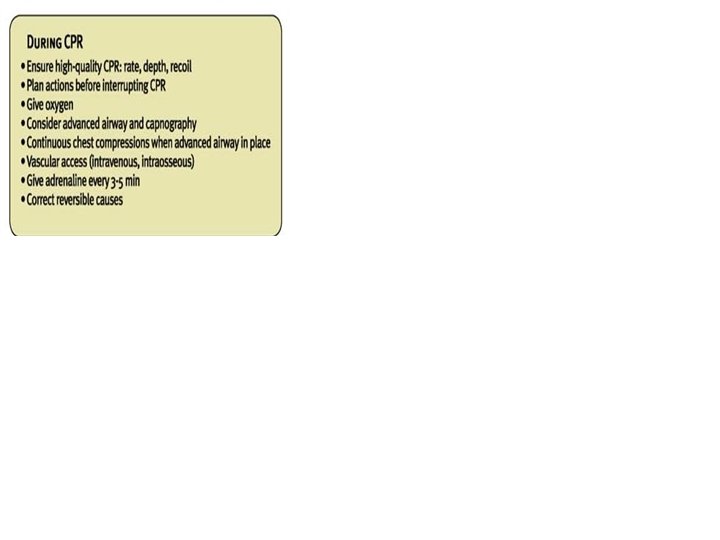 • Adrenaline. – The optimal dose of adrenaline is not known – for VF/VT give adrenaline after the third shock once chest compressions have resumed, and then repeat every 3– 5 min during cardiac arrest – If the initial monitored rhythm is PEA or asystole, start CPR 30: 2 and give adrenaline 1 mg as soon as venous access is achieved. If no pulse is present (or if there is any doubt about the presence of a pulse), continue CPR. Give adrenaline 1 mg (IV) every alternate CPR cycle (i. e. , about every 3– 5 min) once vascular access is obtained. • Amiodaron – if VF/VT persists after three shocks, give 300 mg amiodarone by bolus injection. • • • A further dose of 150 mg may be given for recurrent or refractory VF/VT, followed by an infusion of 900 mg over 24 h sodium bicarbonate (50 mmol) if cardiac arrest is associated with hyperkalaemia or tricyclic antidepressant overdose; repeat the dose according to the clinical condition and the result of seriál blood gas analysis Atropine its routine use for asystole or PEA is no longer recommended