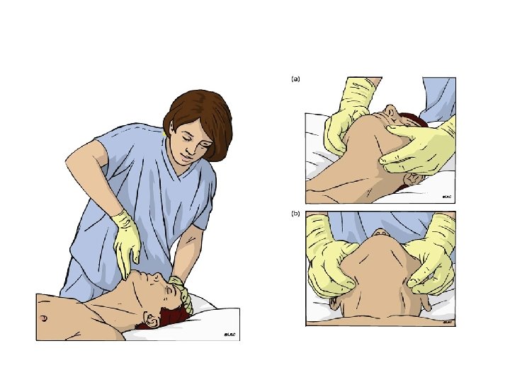 place your hand on his forehead and gently tilt his head back; ◦ with your fingertips under the point of the victim’s chin, lift the chin to open the airway