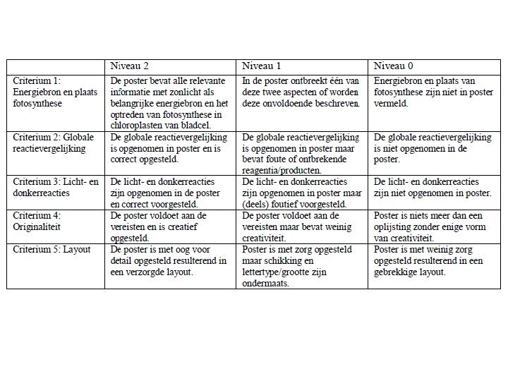 Rubrics voorbeelden Biologie: De leerlingen maken een schematische voorstelling op posterformaat van het fotosyntheseproces in een cel van een blad.
