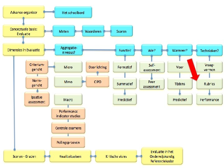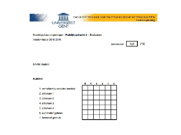 Rubrics • Evaluatie van complexe leerdoelen • Een rubric is opgebouwd uit 3 delen – Een aantal criteria – Per criterium eenzelfde aantal niveaus van kwaliteit – De kwalitatieve omschrijving van het niveau per criterium noemen we een indicator. • Te ontwikkelen door: üLeerkracht üLeerling • Geschikt voor summatieve én formatieve evaluatie