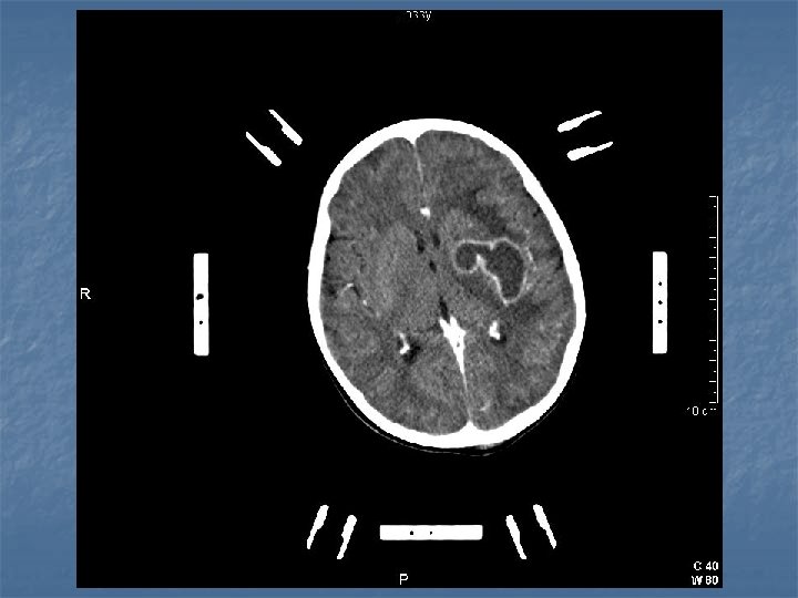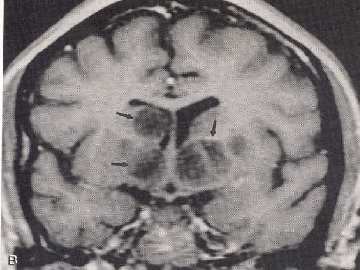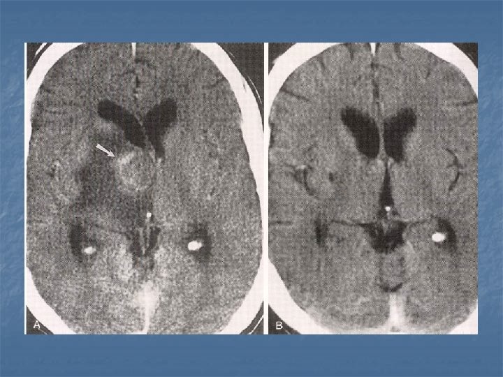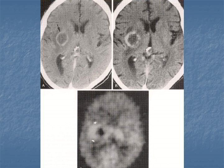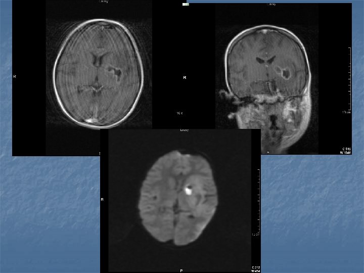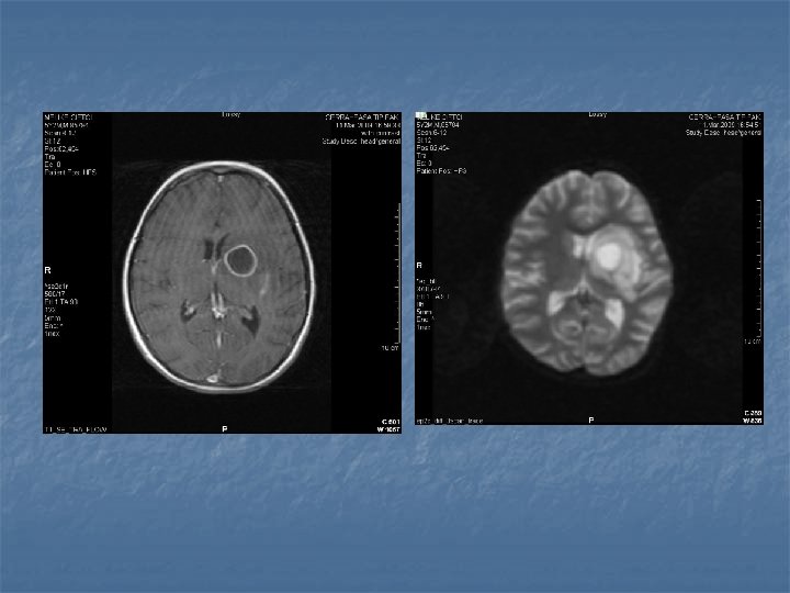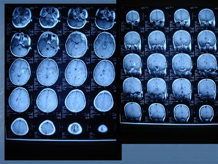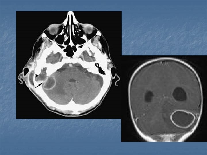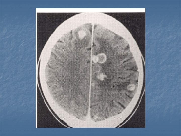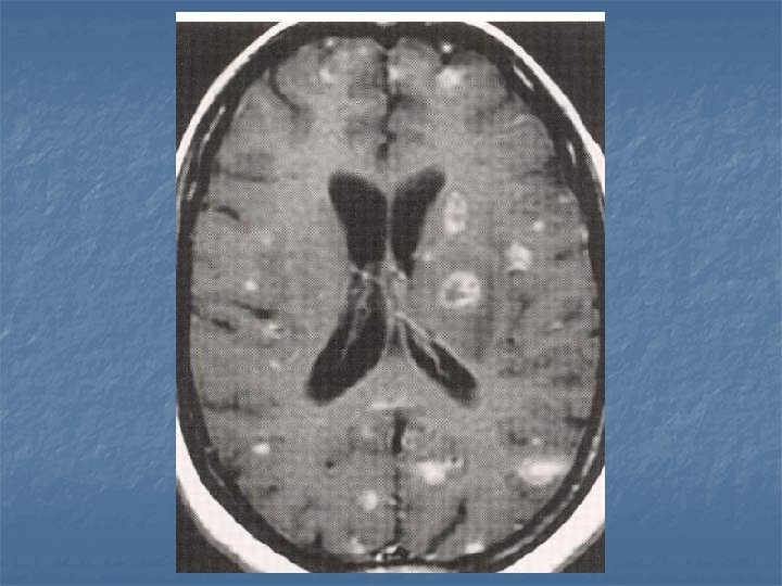 Toxoplasmosis n n n Yer kaplayan lezyonların % 60’ı % 30 olguda mevcut Kortikomedüller bileşke (? ), basal ganglion ve talamusda sık tutulum BT-MR. . . >5 lezyon, halka tarzında kontrast (+), nodüler, ödem ve kitle etkisi Erken tanı önemli. . . tedavi edilebilir 2 hafta primethamine+sulfadiazine