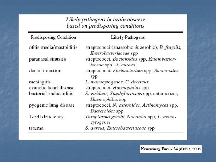 Etkenin Geliş Yolu n n 1. Kan yoluyla : Uzaktaki bir enfeksiyon odağından (en sık bakteriyel endokarditte, akciğer absesinde) bakteriyemi sonrasında arteriyel septik emboliler gelebileceği gibi komşu perikranyal yapıların venlerinden retrograd yayılım olabilir. 2. Komşuluk yoluyla : Paranazal sinüslerin, orta kulağın veya mastoid hücrelerin enfeksiyonunun intrakranyal bölgeye uzanmasıyla ortaya çıkabilir. n 3. Kongenital bir cilt defektinden : Açık nöral tüp defektleri olan hastalarda görülür. n 4. Penetran travma veya cerrahi yoluyla : Doğrudan bakterilerle kontaminasyon olur.