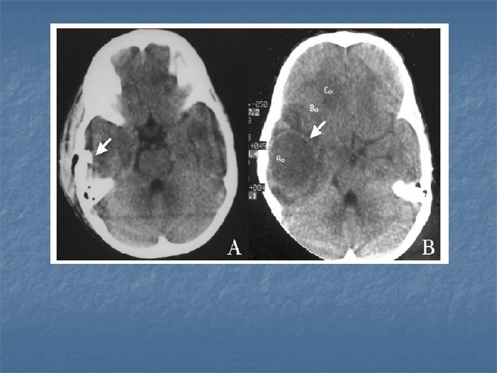 Subdural Ampiyem è Epidural ampiyem ile aynı klinik bulgular è Çok daha ender (anekdotal bildiriler) è İnfekte dermal sinüs’e bağlı è Subdural mesafenin drenaj + irigasyonu +antibiyotik uygulaması ile tedavi