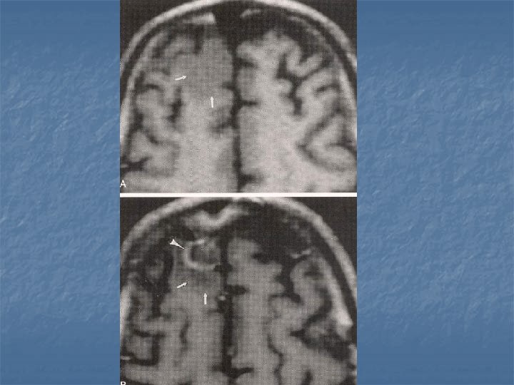 V. Subdural Ampiyem n n Epidural absenin tersine subdural mesafe daha gevşek olduğundan kolaylıkla yayılır. Genellikle ince (0, 5 -2 mm), fibrinöz eksüda şeklindedir. Subdural hematom zemininde de gelişebilir. Semptomları serebral hemisferin bütününü ilgilendirir. Genellikle bilinç hızla kapanır. Epileptik nöbetlere sık rastlanır.