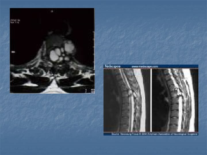Tüberküloma Mikobakterium tüberkülosis infeksiyonunun medulla spinalis’i tutan kronik granülomatöz seyirli formu è Sistemik Tbc’da MSS tutulumu % 0. 5 - 2 è Medulla / intrakraniyal = 1/ 42 è Medulla tuberkulomu/ beyin tuberkülomu = 2/1000 è Literatürde 109 olgu (1830 -1996) è Kronik progresif seyirli, intramedüller tümör ile ayrıcı tanı yapılmalı è Cerrahi doku tanısı ve tedavinin parçası è è Antitbc + kortikoterapi