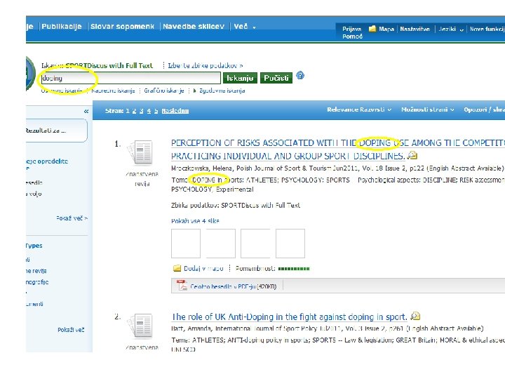 Iskalno okno osnovnega iskanja (prostega iskanja – neomejeno na iskalna polja) V iskalno okno vpisujemo besede (doping), številke (2009) itd. GLEJ naslednja prosojnica