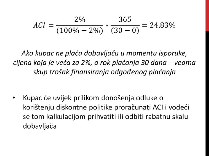 USLOVI PRODAJE DOBAVLJAČA • Preduslov za slobodan izbor kupca jeste dostatna likvidnost • Ako kupac ne može finansirati prijevremeno plaćanje, bez obzira na ACI, on će preferirarti odgođeno plaćanje • S obzirom na sve pozitivne strane zaduživanja kod dobavljača, preduzeće će vržiti pritisak na produžavanje rokova odgode plaćanja. • Pozitivne i negativne strane: • • Dodatno kratkoročno finansiranje (+); Oportunitetni trošak trgovinskog rabata (-); Penali za kašnjenje (zatezna kamata) (-); Pogoršanje rejtinga kupca (-).